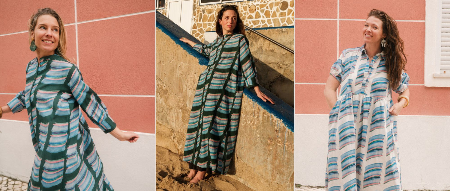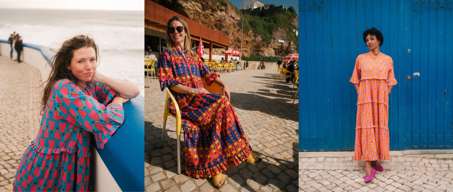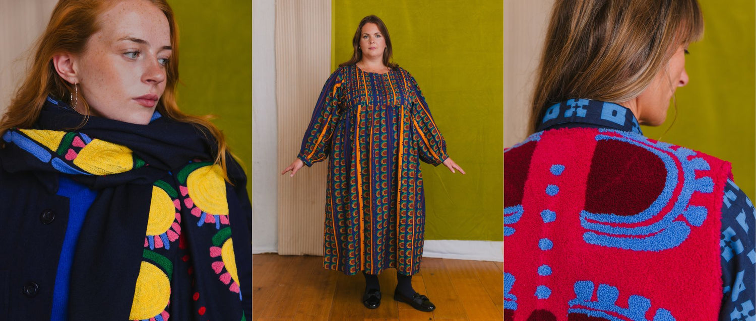 Passionate about print husband and wife duo Alice Begg and Robbie Humphries design boldly printed clothing for the everyday. Creating items they love to wear themselves, the shapes are loose and comfortable, statement but relaxed. Alice designs all the prints in a playful naive style, these are then screen printed onto 100% natural fabrics by a small team in Jaipur, India. The method means there are always minor imperfections giving the clothes a unique, hand crafted, organic feel.