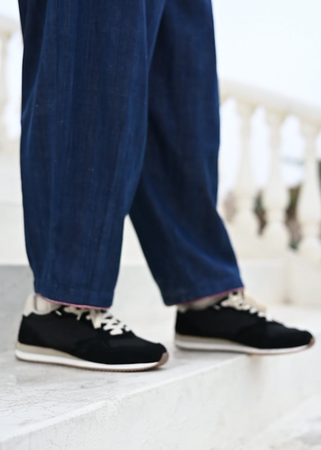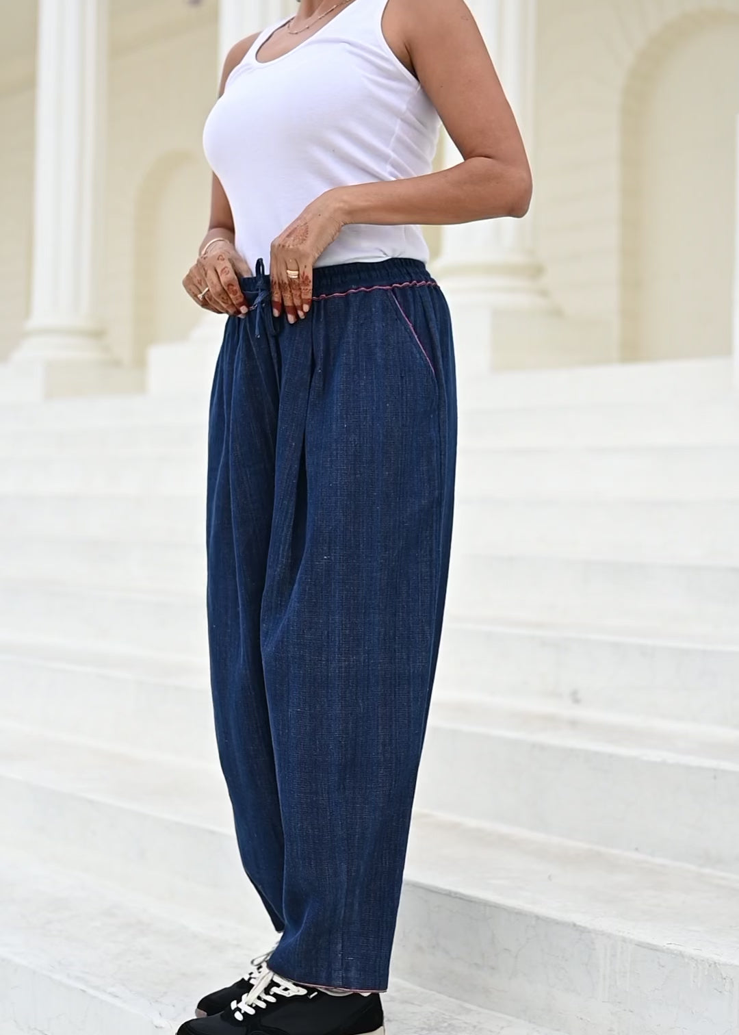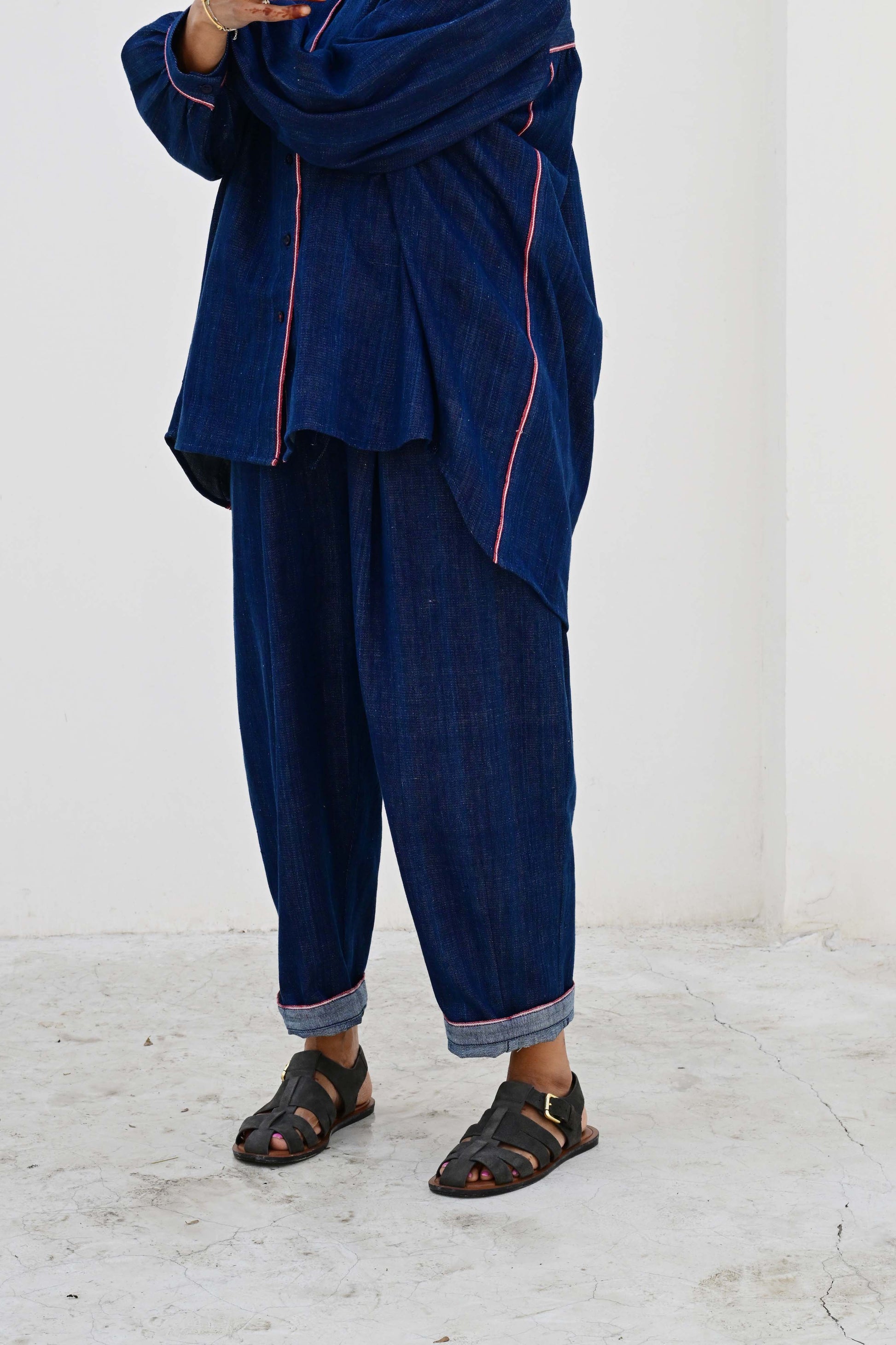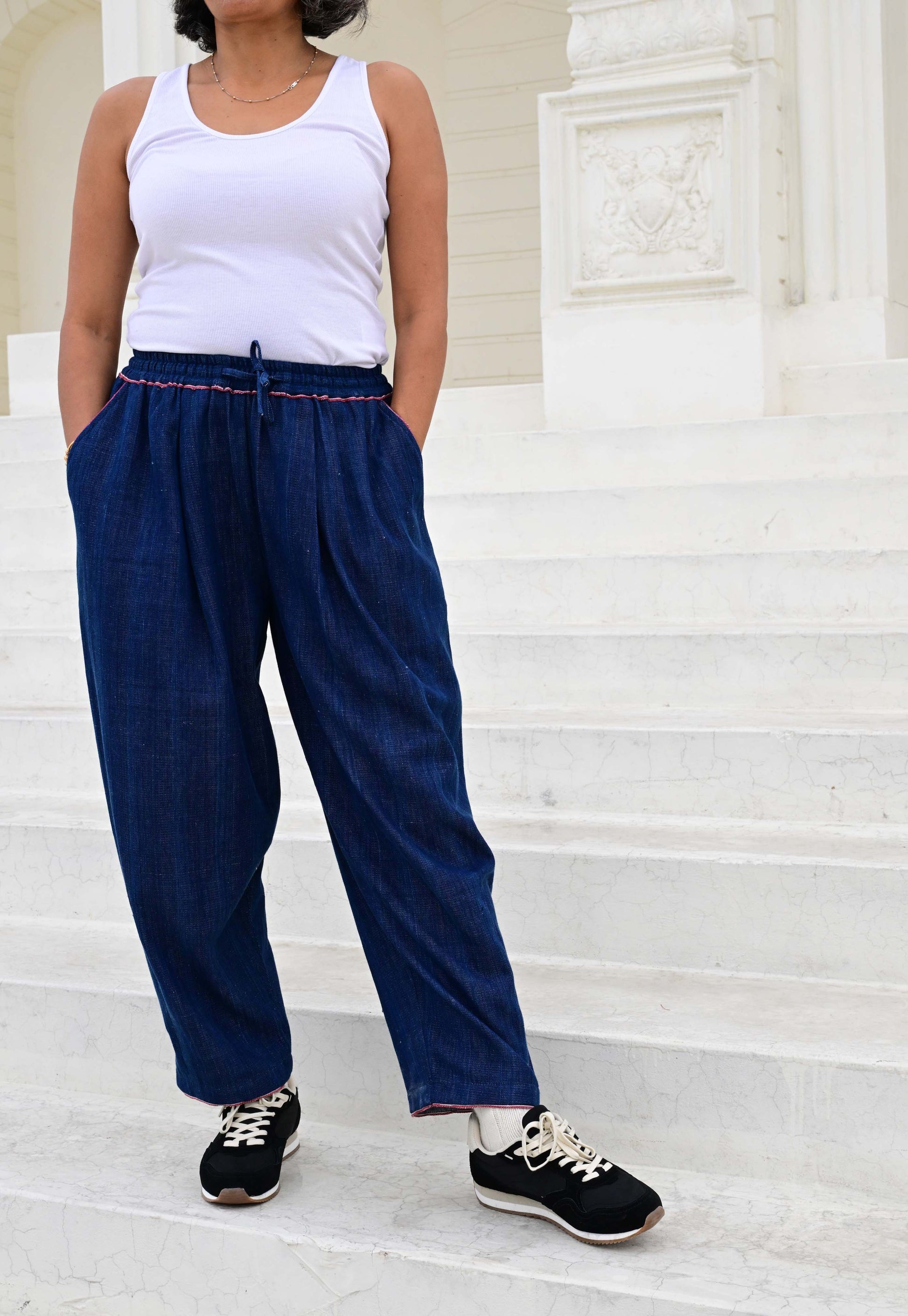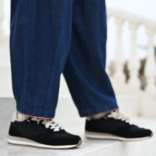 Crafted from hand-dyed, hand-woven indigo fabric with the selvedge edge - traditionally hidden - carefully revealed at the waistband as a subtle, beautiful detail.