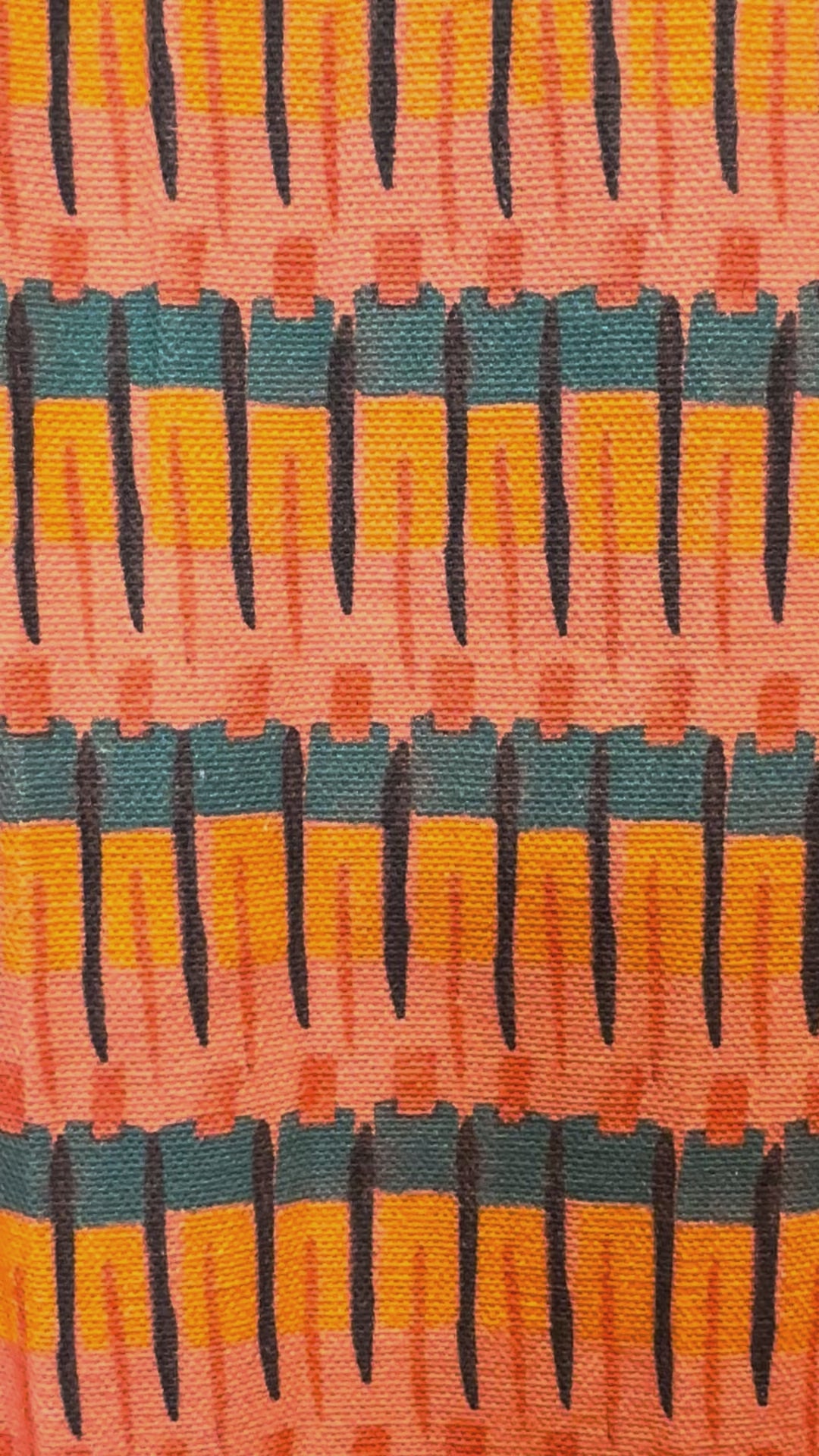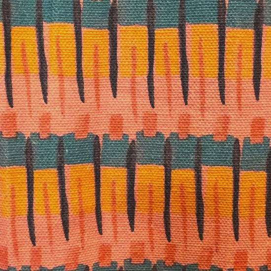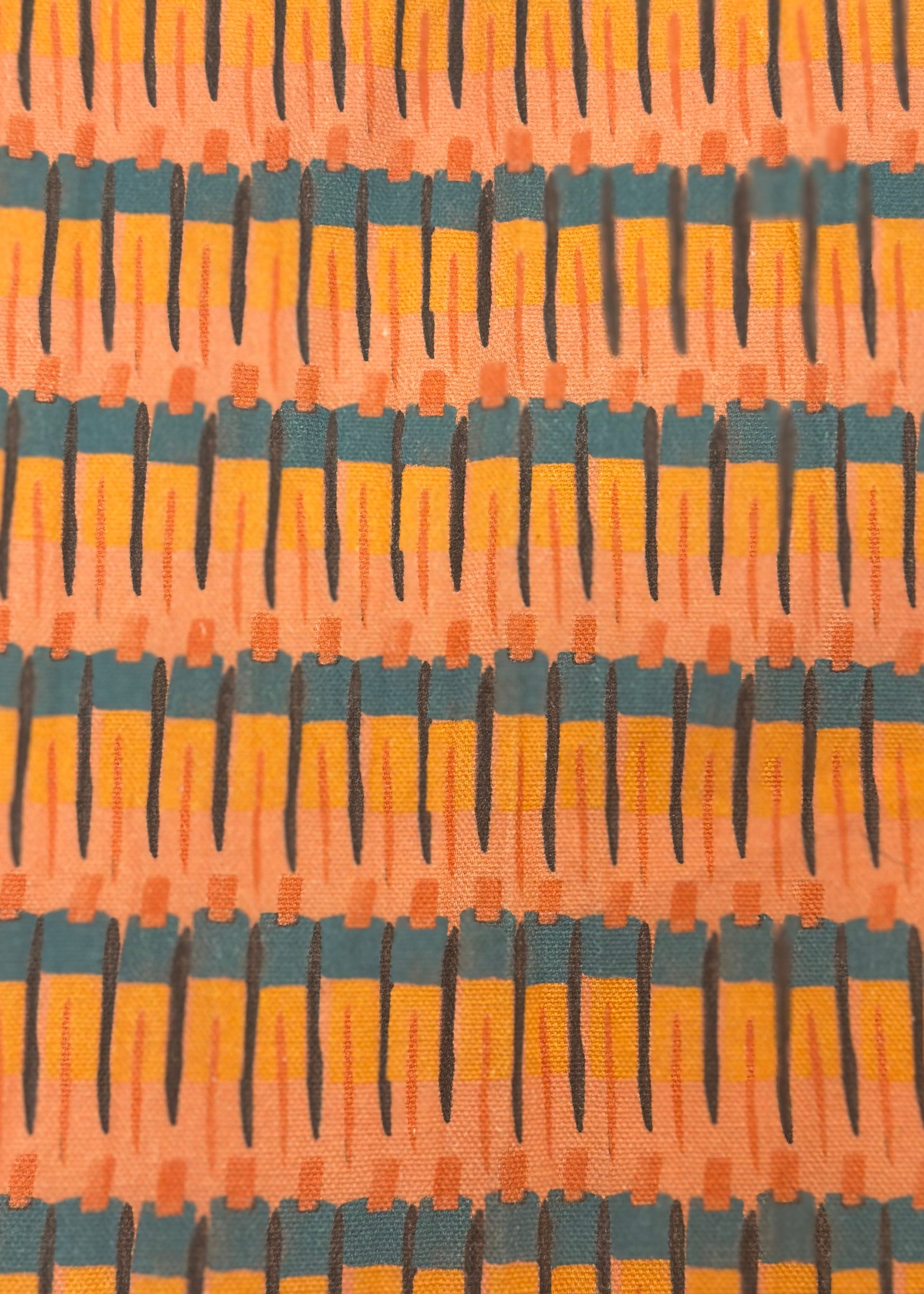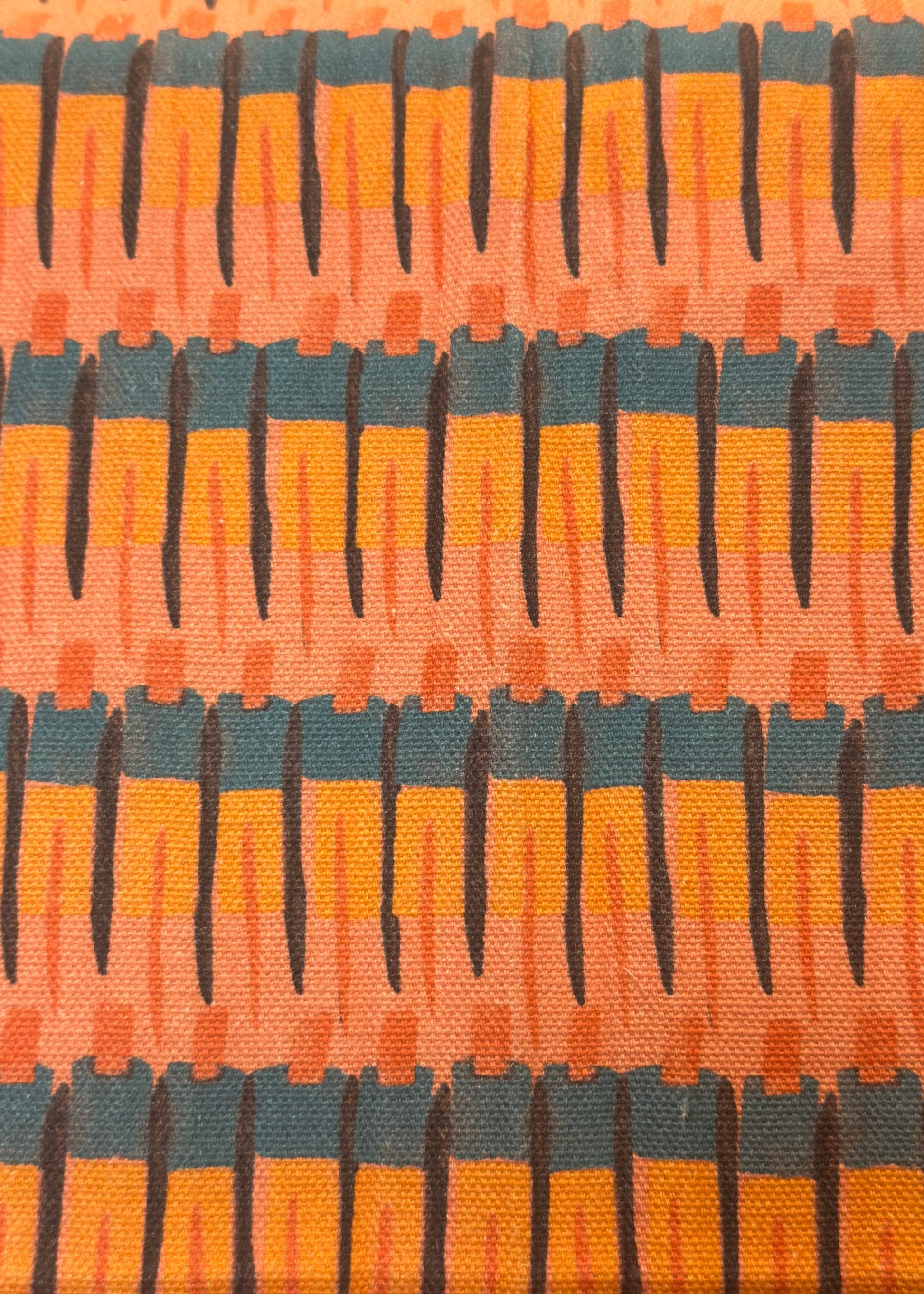 Our fun 'Row of Soldiers' print in a rich pink, ochre and turquoise amongst other colours.