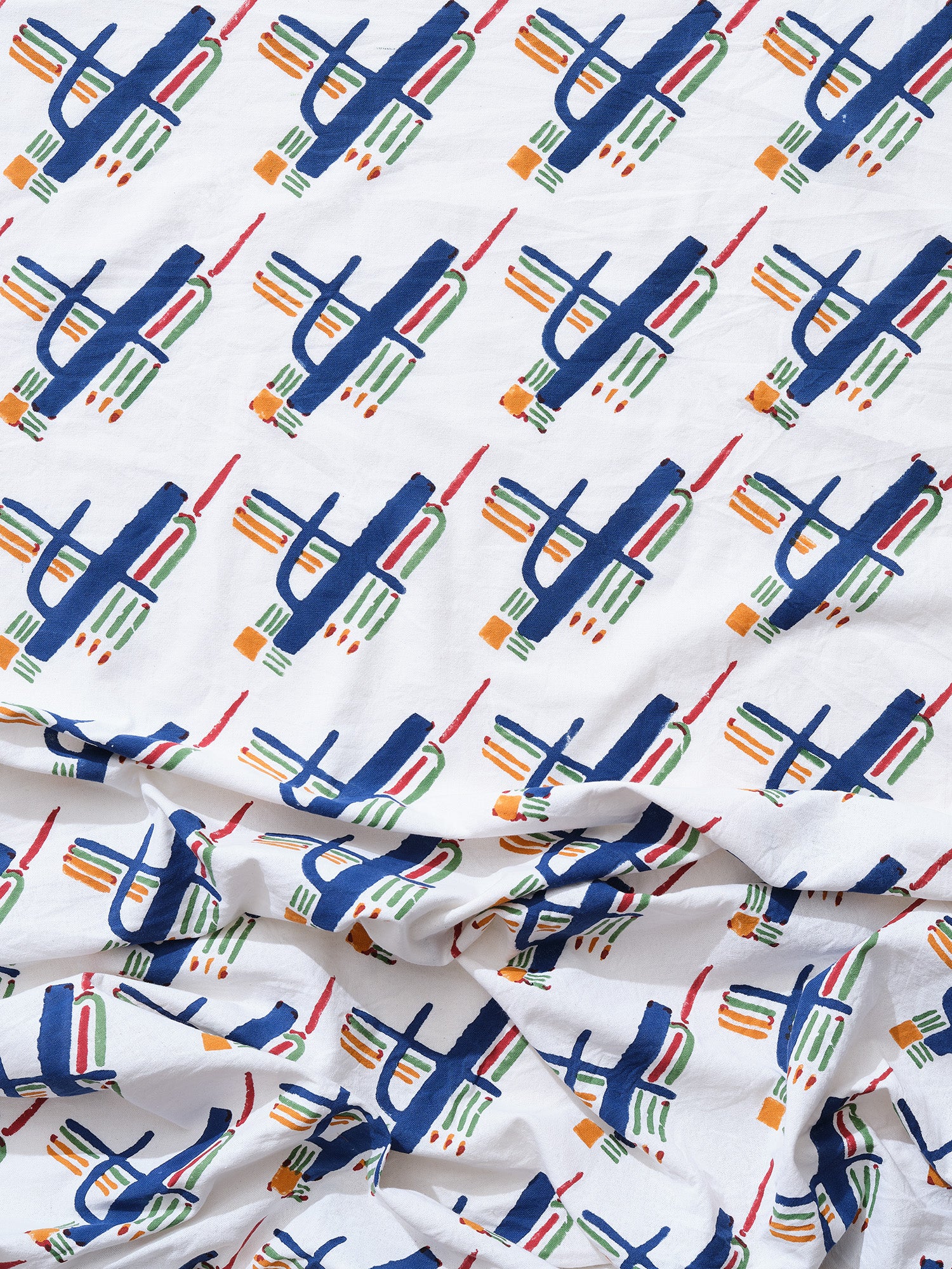 The fabric has been printed by hand using carved wooden blocks. An ancient printing process very traditional in Jaipur, India. Which gives the design a relaxed organic feel. You will notice tiny dots running through the fabric which is how the printers know where to place the next blocks in the repeat.