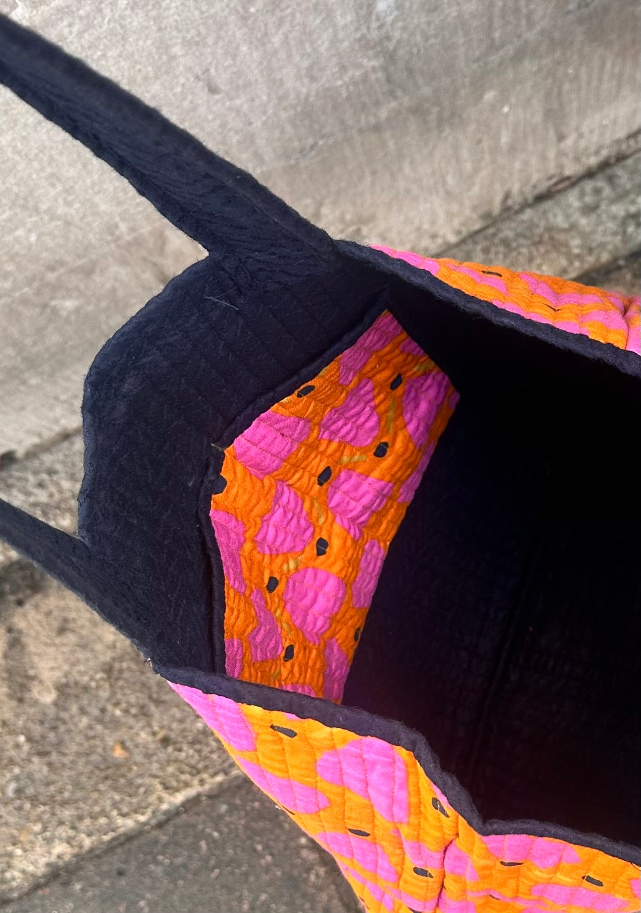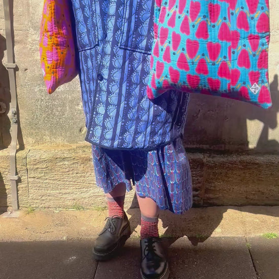A bold twist on everyday practicality - our brand new quilted bag is handmade in from soft cotton in one of our signature vibrant prints. Spacious enough for your daily essentials — from notebooks and groceries to picnic supplies — and with two handy inside pockets it’s lightweight, durable, and endlessly versatile. The comfortable wide straps make it easy to sling over your shoulder, while the playful print ensure it turns heads everywhere you go.