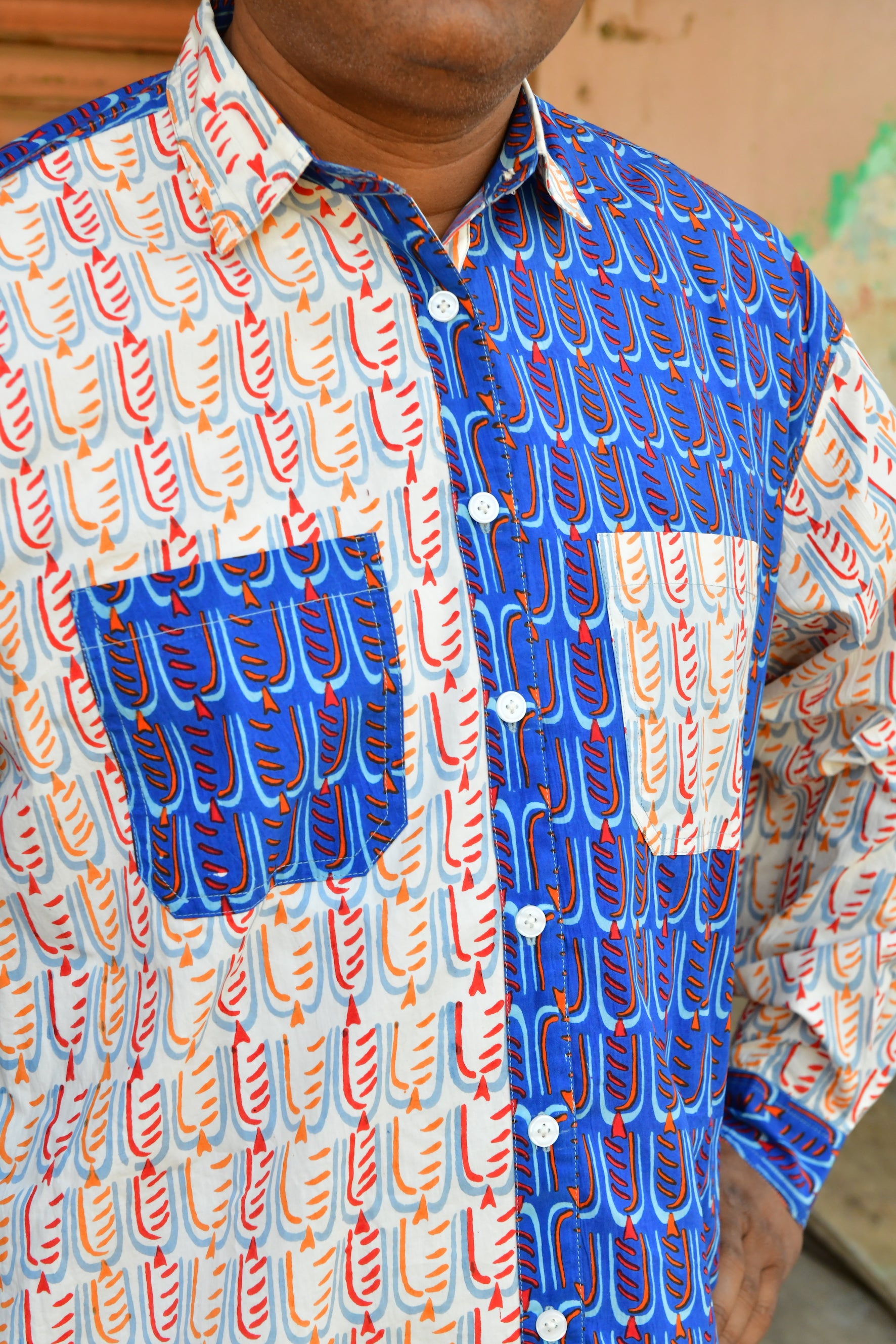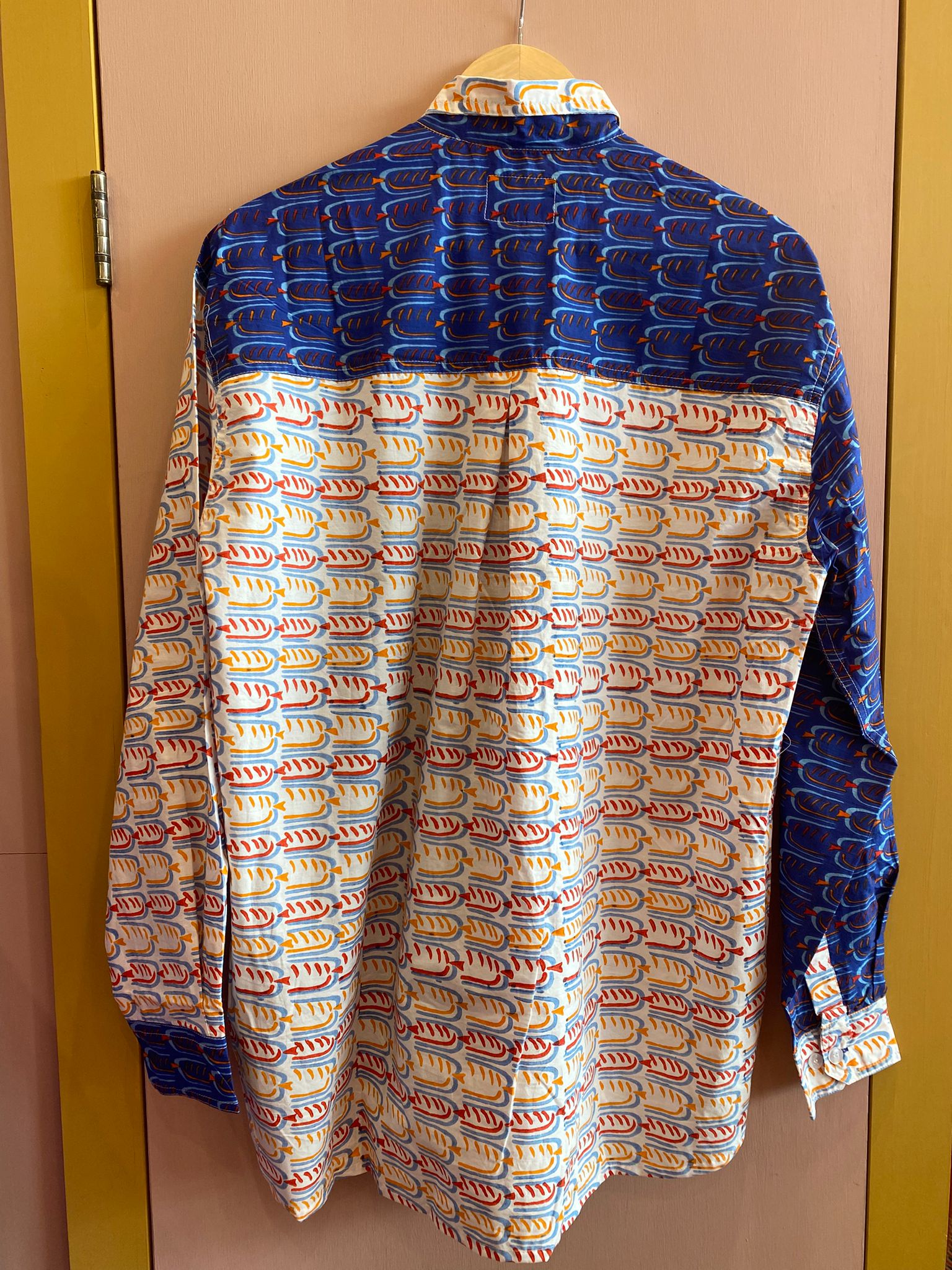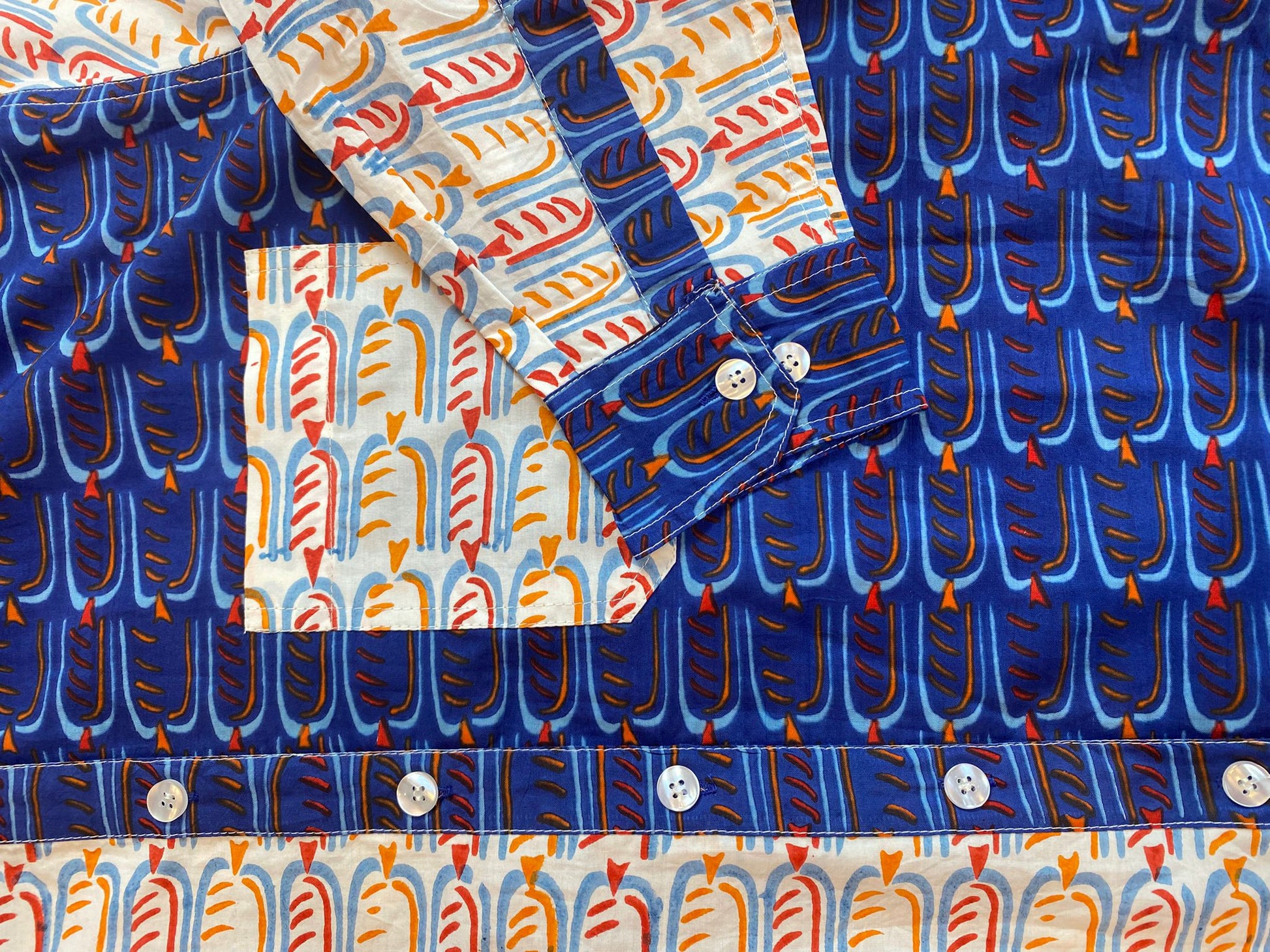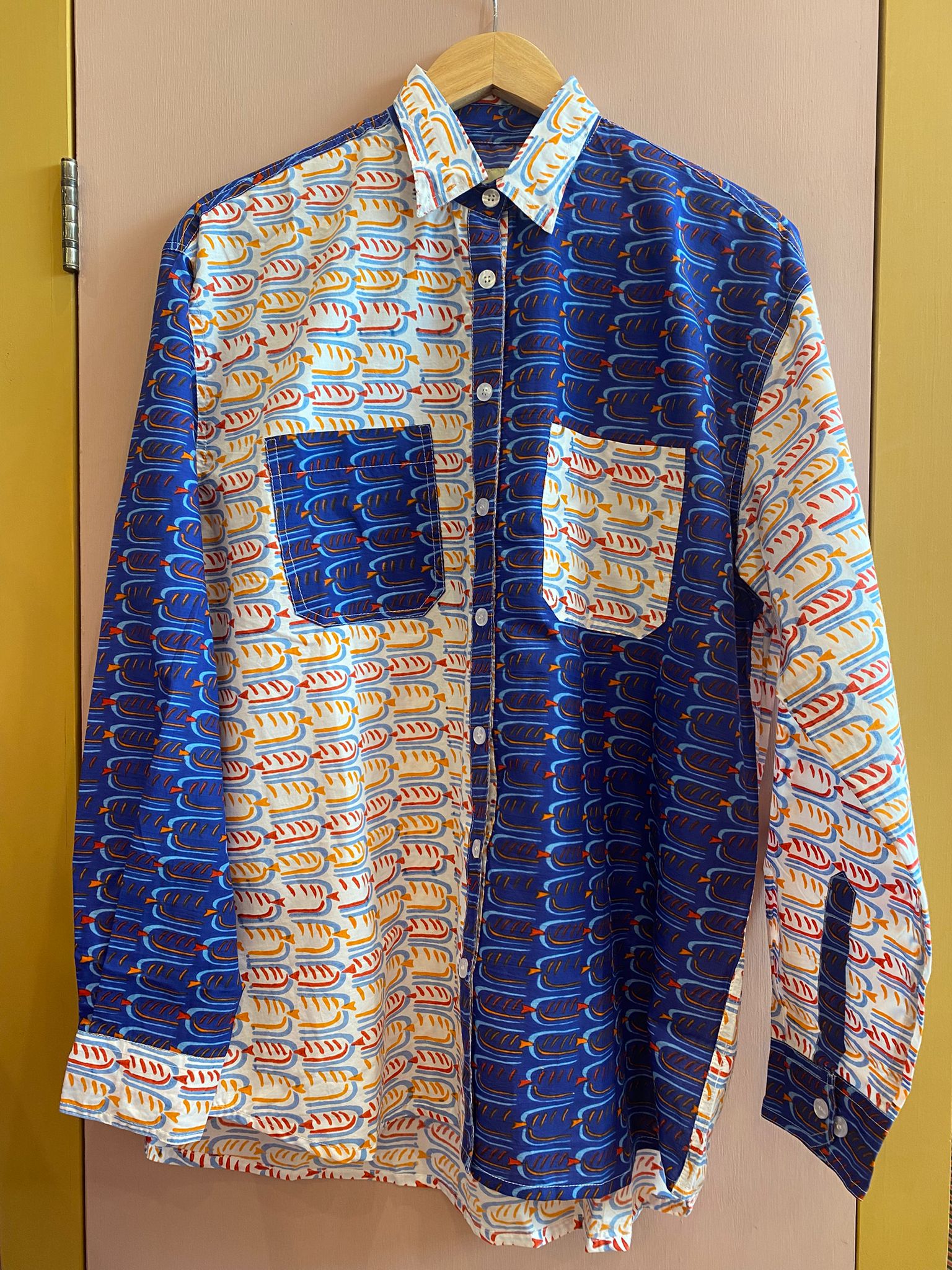 100% cotton poplin, screen printed unisex shirt in a patchwork of our new complementary prints 'Beaky on Blue' and 'Beaky on White'.