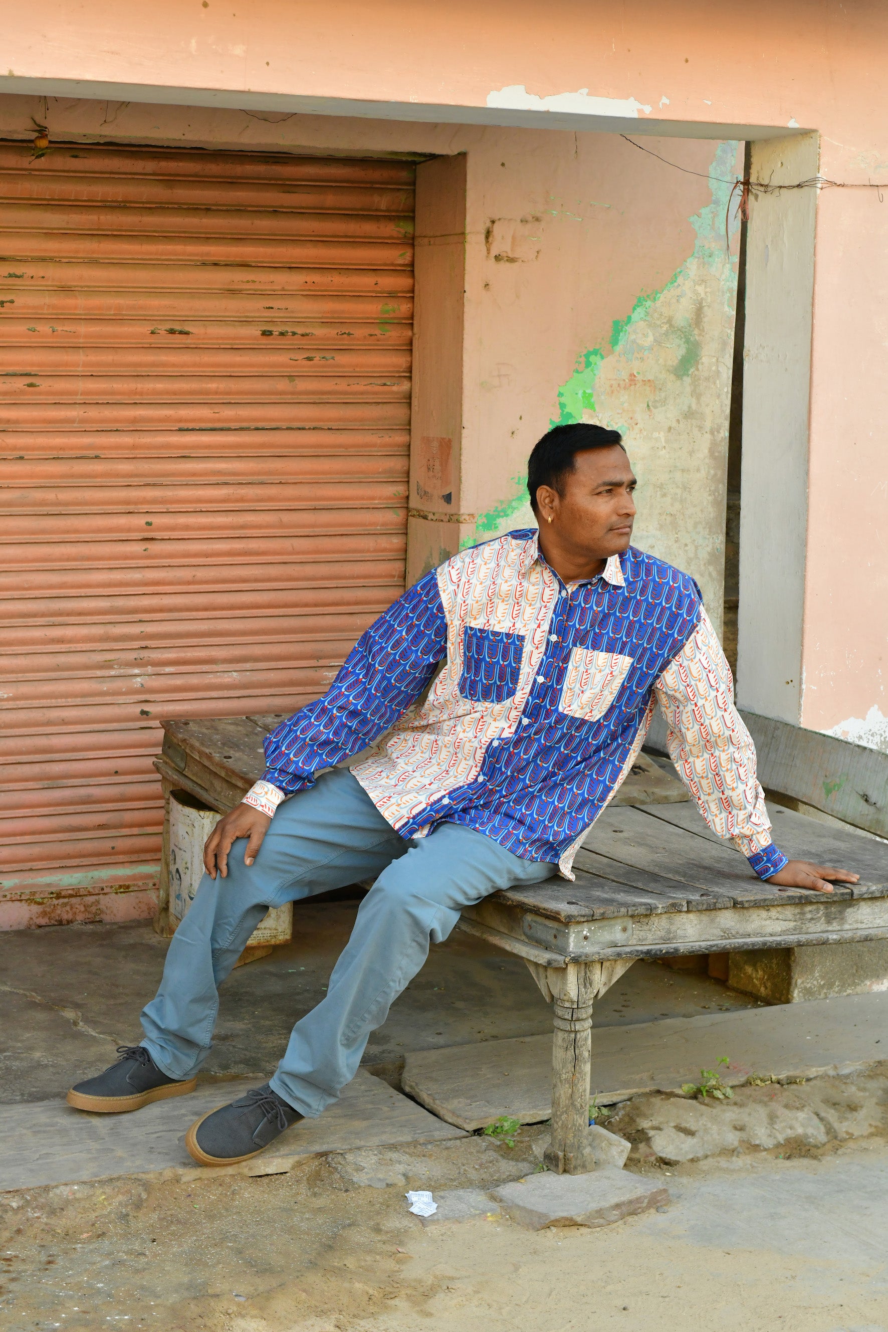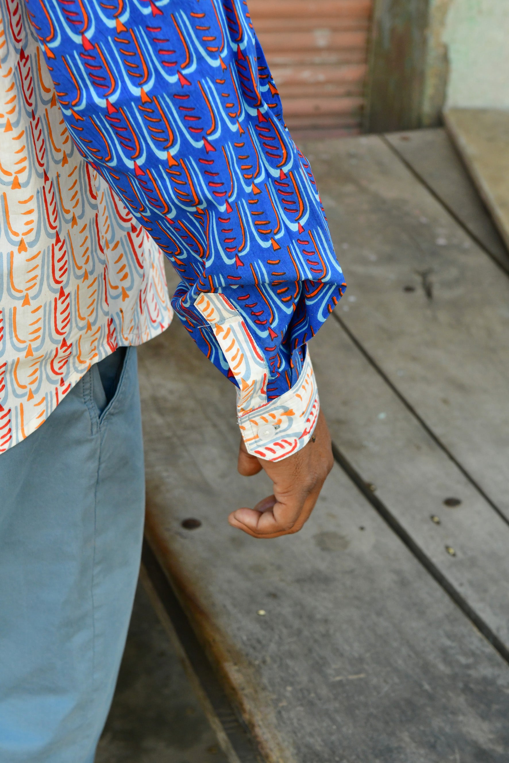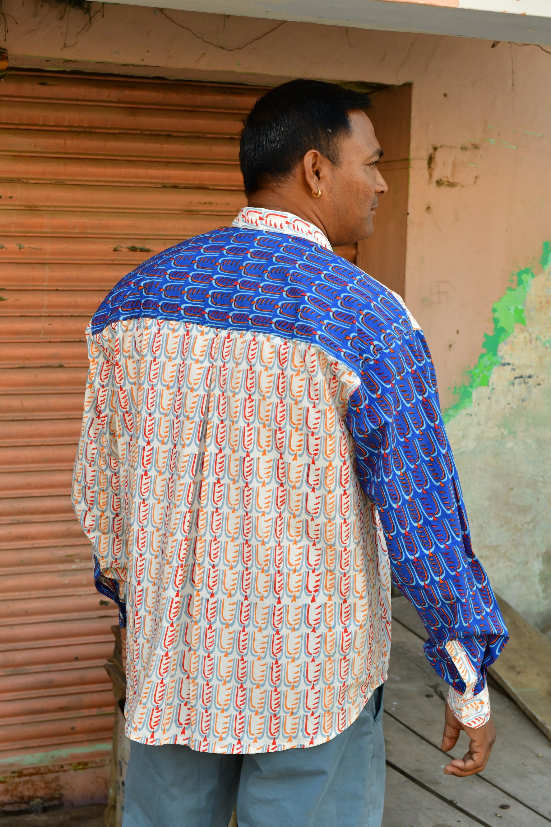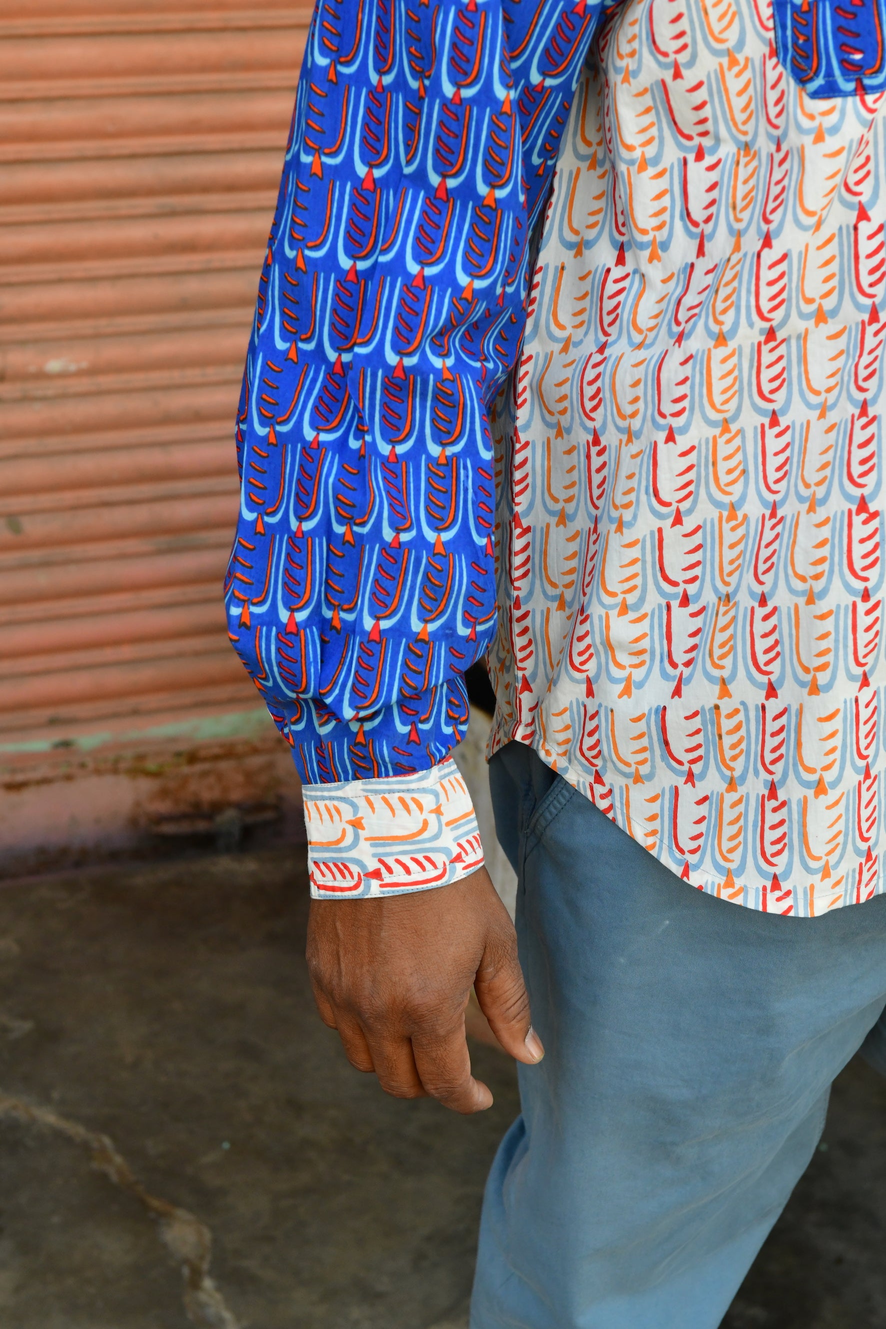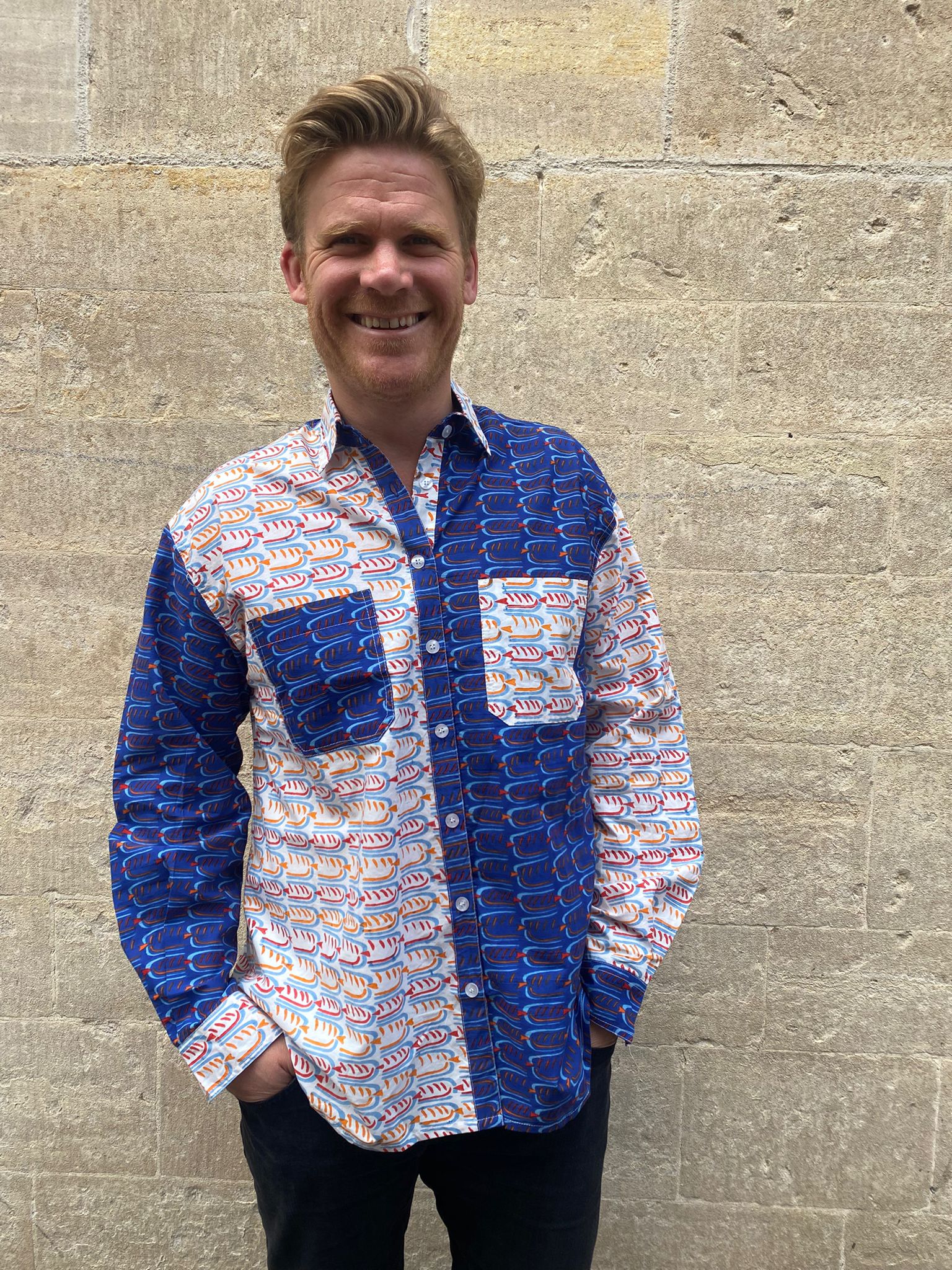 100% cotton poplin, screen printed unisex shirt in a patchwork of our new complementary prints 'Beaky on Blue' and 'Beaky on White'.