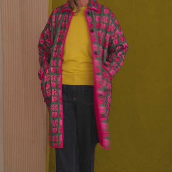 Our long oversized quilted overcoat in the brilliant new green & pink 'Divine Forest' print. Pretty invincible, these coats are built to last. They can be worn even on damp days and make a great wind blocker, not too hot, they keep the warmth in and are roomy enough so you can layer up underneath.